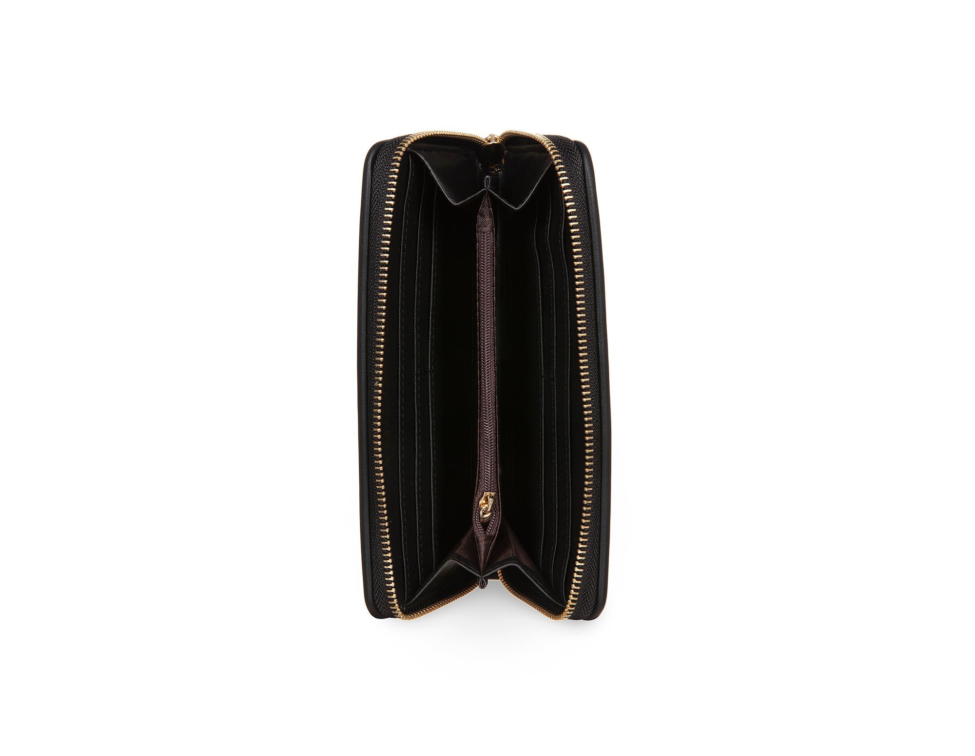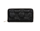 Quilted imitation leather wallet, rigid, has two large compartments, a central zip pocket for coins, and numerous slots for credit cards.
