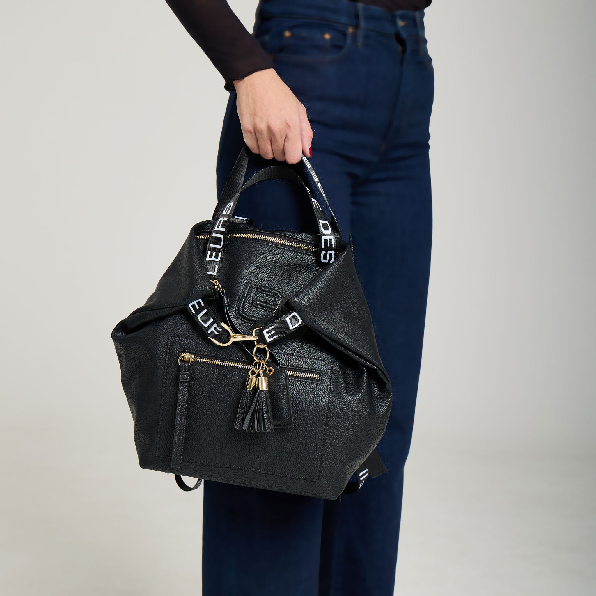 La lavorazione in pelle vegana certificata RCS offre una texture morbida, resistente e water friendly, perfetta per l’uso quotidiano.